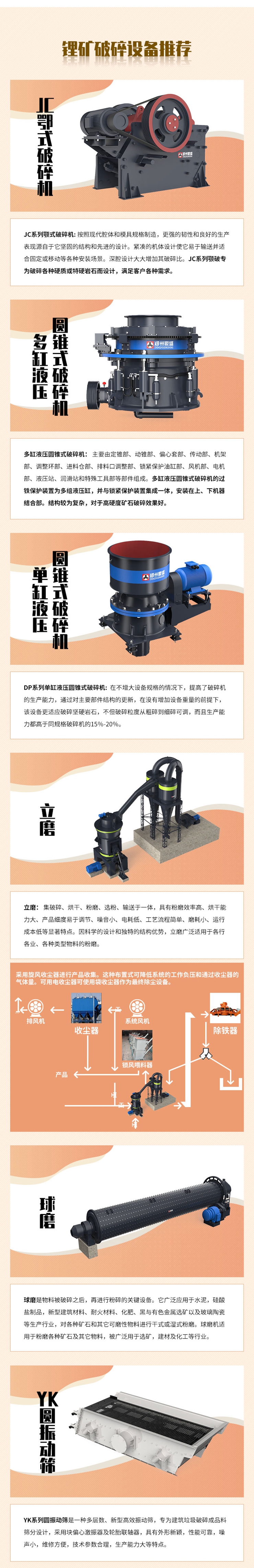 一個有效的鋰礦破碎生產線應具備破碎線、磨礦線、選礦線及一些輔助設備,破碎磨粉工藝流程大致如下: