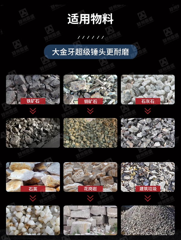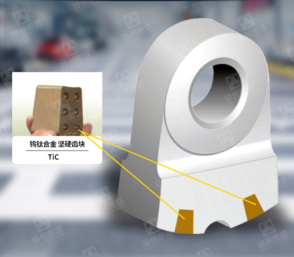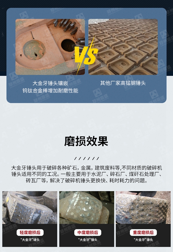 采用爐外精煉,鋼水更純凈,錘頭整體采用壓力鑄造,組織更致密。錘頭本體如同鑲牙一般鑲鑄極其堅硬的鎢鈦合金齒塊,尤其適合高硅、堅硬、耐磨蝕性石灰石。