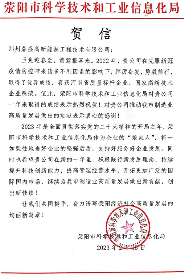 2月15日,滎陽市科學技術和工業(yè)信息化局向鄭州鼎盛高新能源工程技術有限公司(以下簡稱“鄭州鼎盛”)發(fā)來賀信。向公司過去一年取得優(yōu)異成績表示祝賀,恭賀鄭州鼎盛喜獲河南省質(zhì)量標桿企業(yè)、國家高新技術企業(yè)等殊榮。對鄭州鼎盛推動滎陽市制造業(yè)高質(zhì)量發(fā)展做出的貢獻表示感謝。