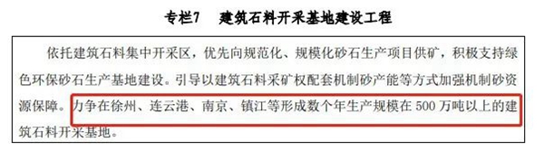 《規劃》強調長江經濟帶、長三角區域一體化發展等國家發展戰略實施,新型工業化、新型城鎮化的推動以及大量基礎設施建設,對礦產資源的需求仍將維持在高 位。砂石資源供需矛盾突出,要統籌實施國家戰略性礦產和江蘇重要礦產的勘查開發,保持一定規模的礦產開采總量,提高礦產資源保障能力,規模化開采建筑石料,滿足經濟社會發展需求。
