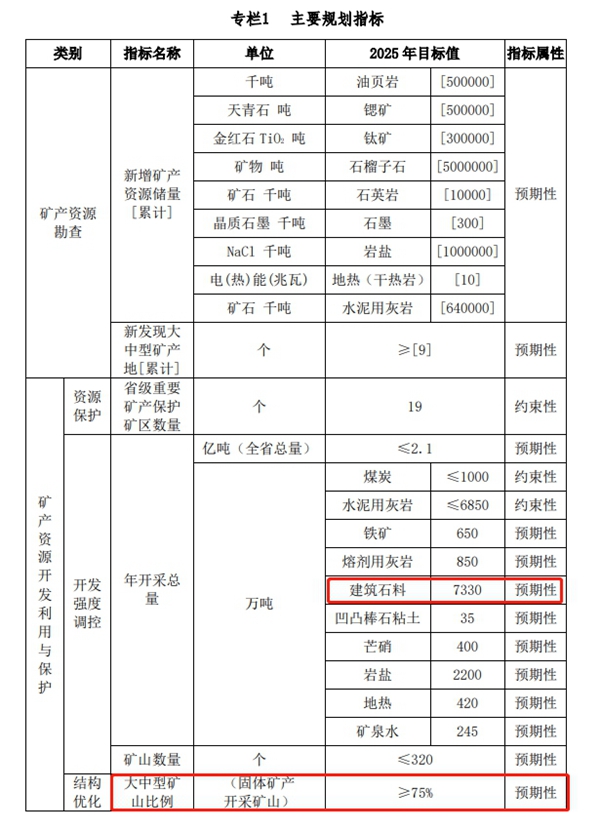 2025 年全省礦產開采總量預期在 2.1 億噸以內,礦山數量預期在 320 個以內。加強各市礦山總數和年開采總量的科學調控, 促進礦產資源的節約集約利用,保障經濟社會發展的資源需求。重點調控10個主要開采礦種(見專欄 1),其中煤炭、水泥用灰巖等 2 個礦種年開采總量為約束性指標,2025年開采總量控制在7850萬噸以內。熔劑用灰巖、鐵礦、建筑石料、巖鹽、芒硝、 凹凸棒石粘土、地熱、礦泉水等 8 個礦種年開采總量為預期性指標,2025 年開采總量預期約1.21億噸左右。