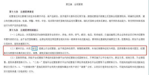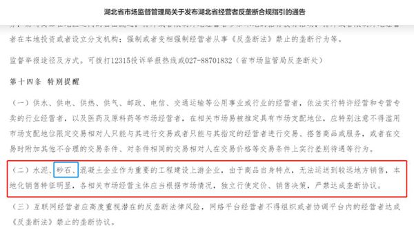 其中陜西、湖北、湖南等地發布的《經營者反壟斷合規指引》中明確指出:水泥、砂石、混凝土行業經營者,由于商品特性使然,銷售距離受限,本地化銷售特征較為明顯,因而銷售市場相對固定,經營者應當根據市場情況獨立定價、銷售,避免實施達成相關壟斷協議行為。